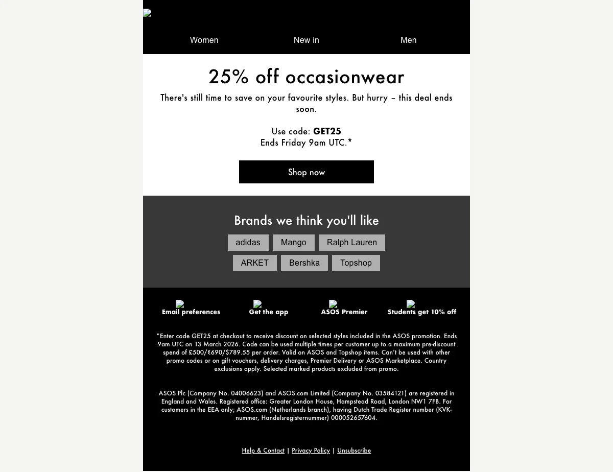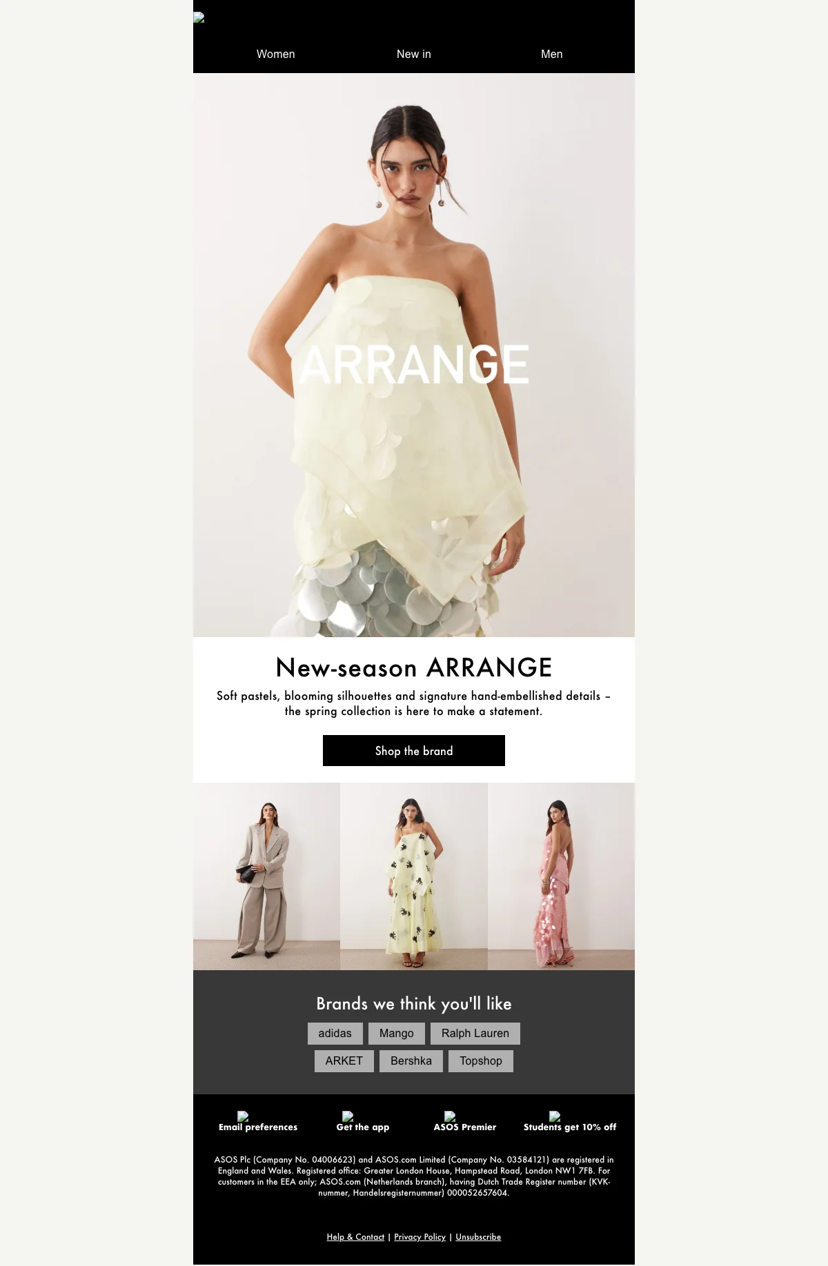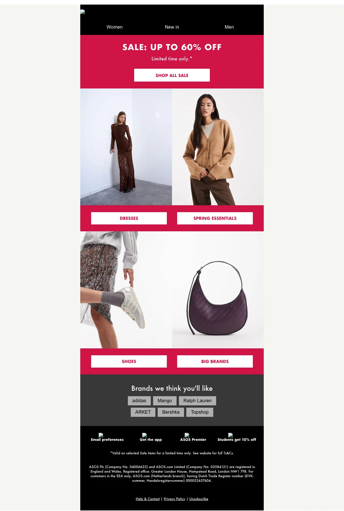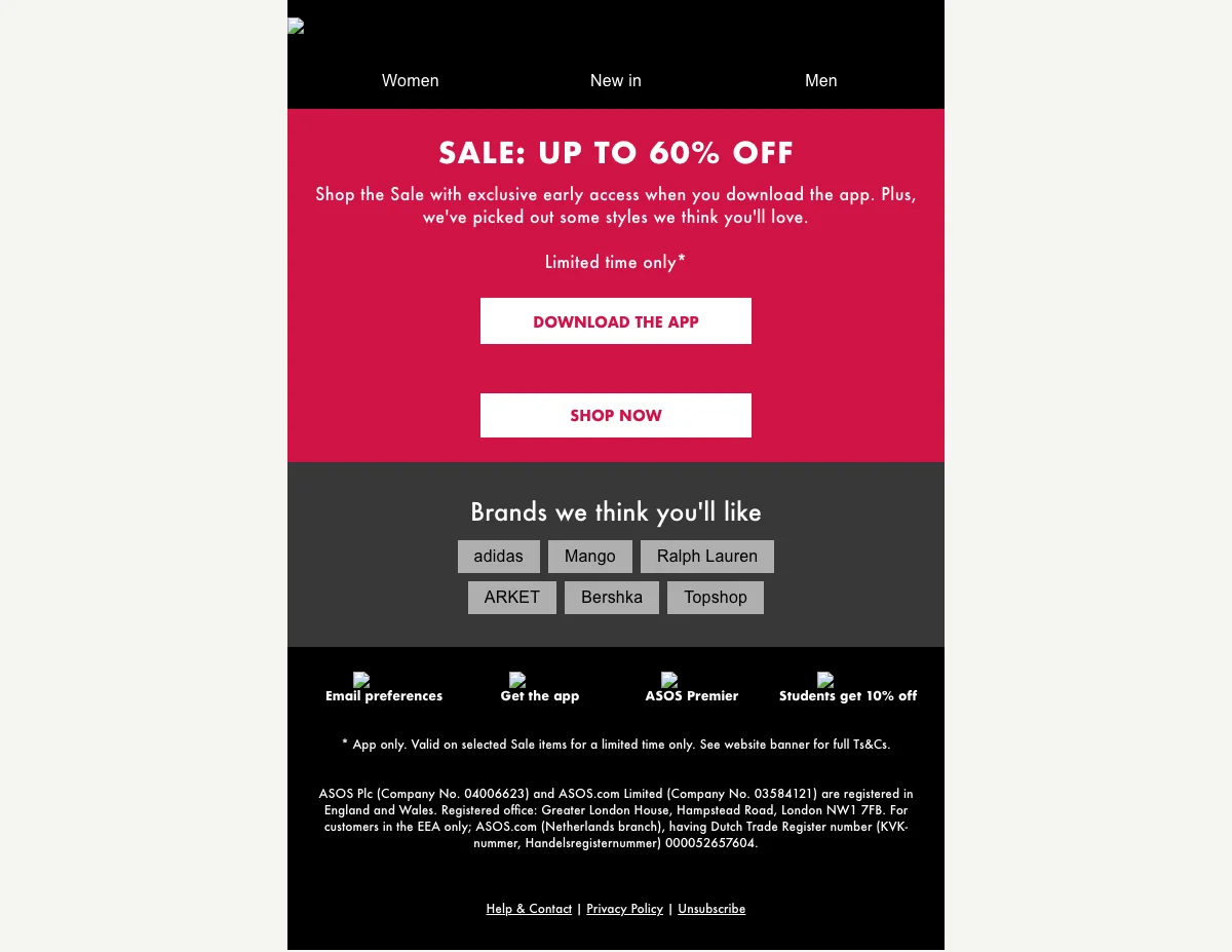 Crée en 2000, la boutique en ligne de mode et beauté propose aujourd'hui plus de 50 000 produits à ses 13,6 millions de visiteurs par mois. Elle offre un large panel de produits, allant du prêt-à-porter féminin comme masculin, en passant par les chaussures, les accessoires ainsi que les cosmétiques. Faire son shopping sur ASOS, c'est la garantie de trouver le produit qu'il vous faut au meilleur prix !