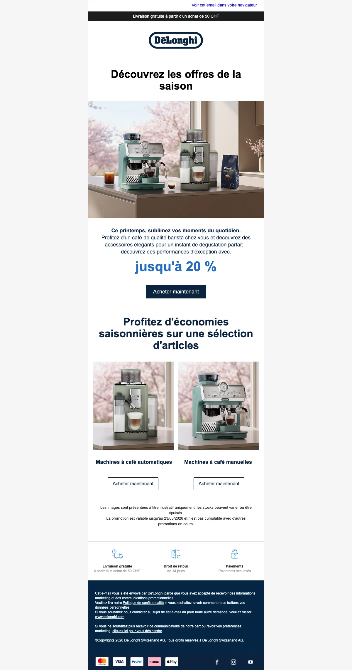 De'Longhi promo printemps machines à café jusqu'à 20% de réduction