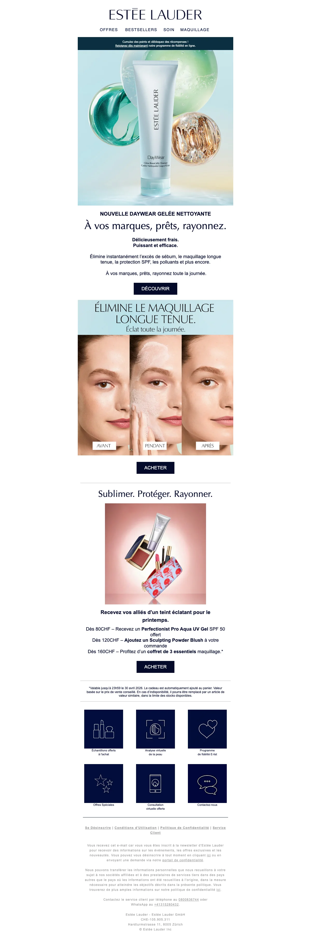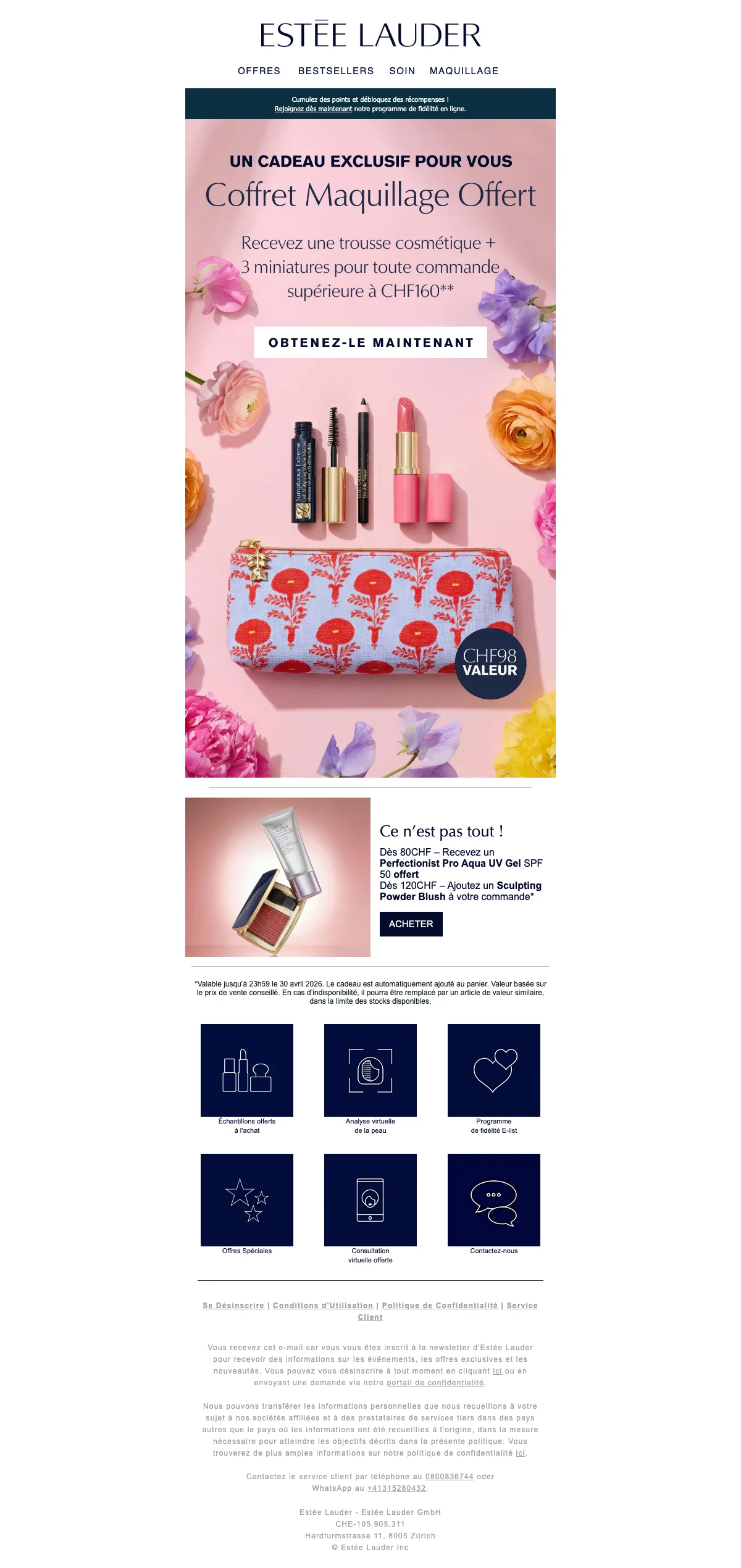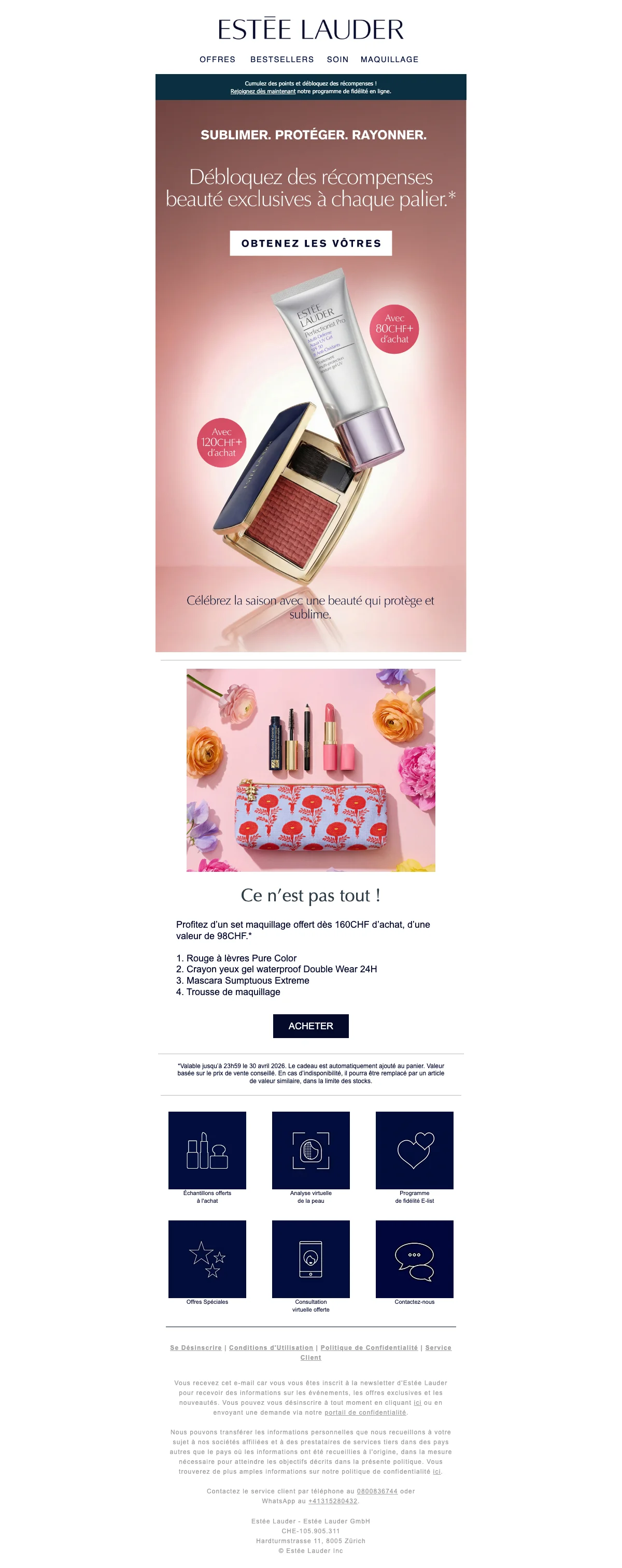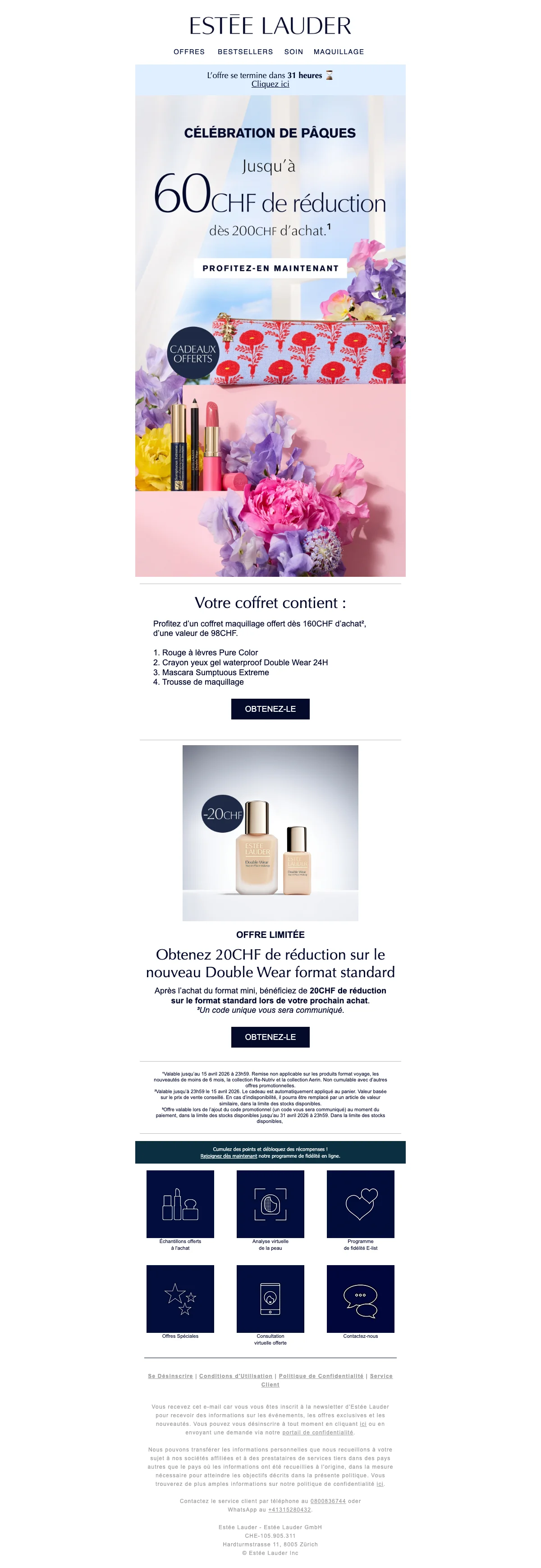 Estée Lauder printemps remises progressives jusqu'à 60CHF et coffret offert