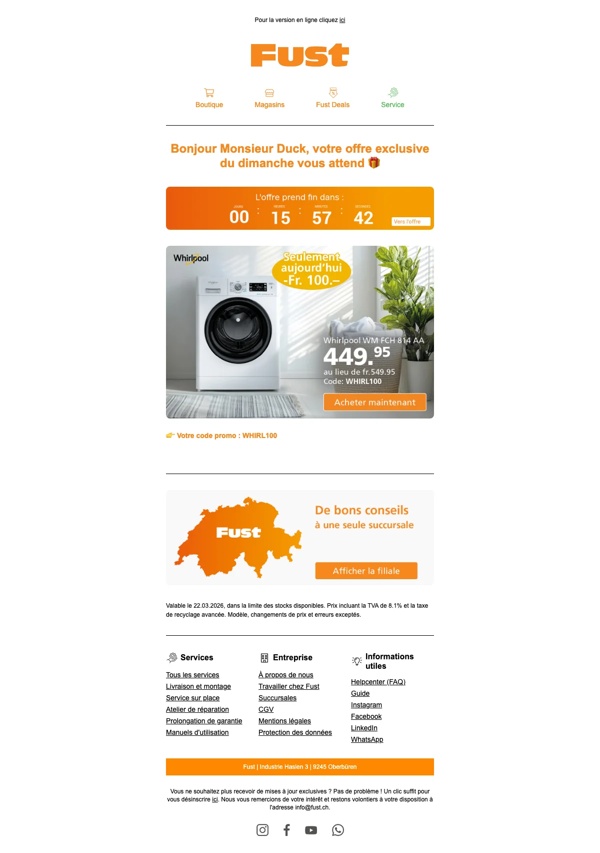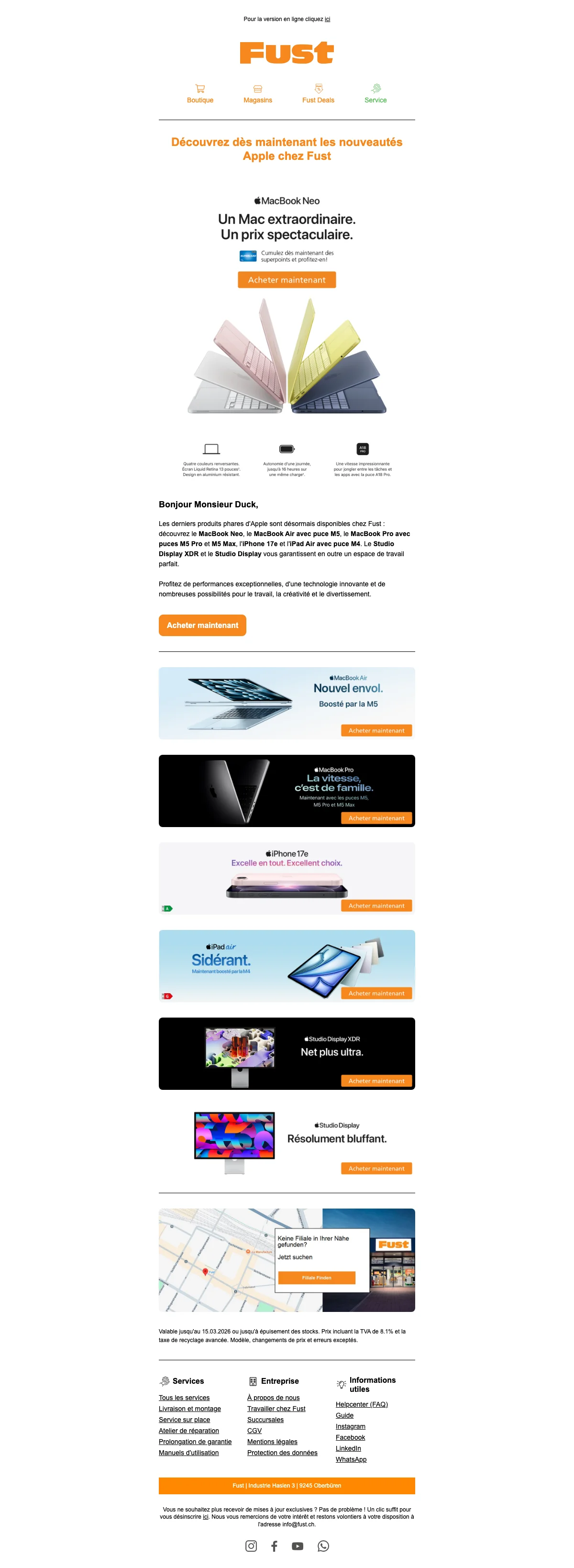 Faire ses achats sur Fust c'est également bénéficier de nombreux services comme par exemple l'aide à la décision afin de savoir s'il est plus judicieux de faire réparer un appareil ou bien d'opter pour un nouvel achat. Vous pourrez aussi bénéficier d'un service d'installation où un employé qualifié vous aidera à prendre en main les travaux d'installation. N'oublions pas le droit d'échange de 30 jours ainsi que la reprise et d'autres services sont également à votre disposition, alors venez en prendre connaissance dès maintenant !