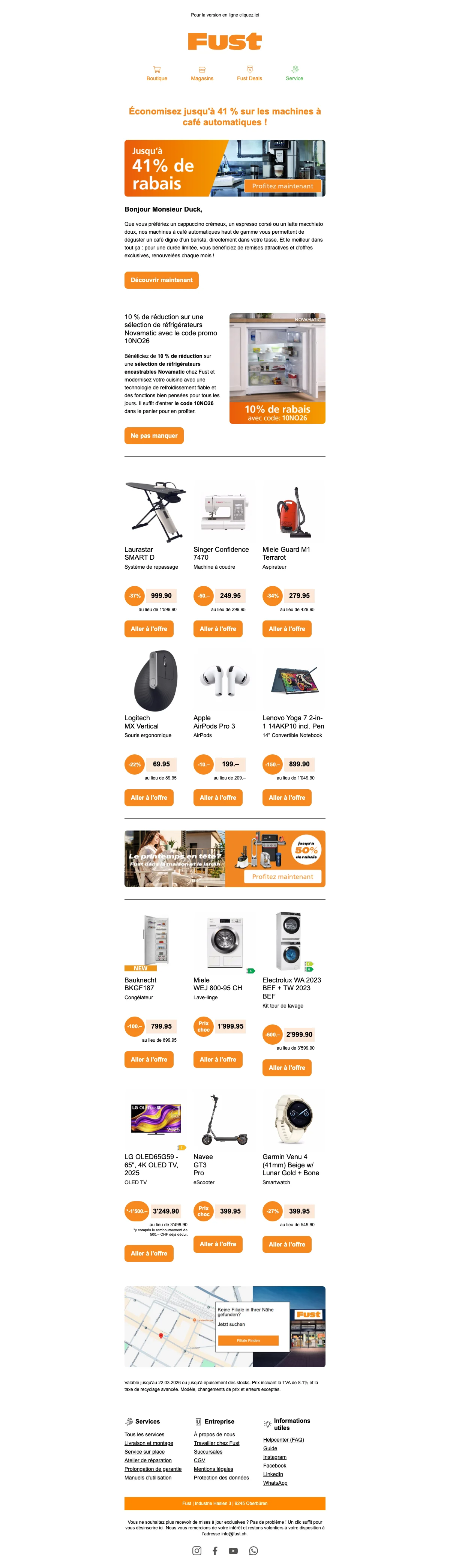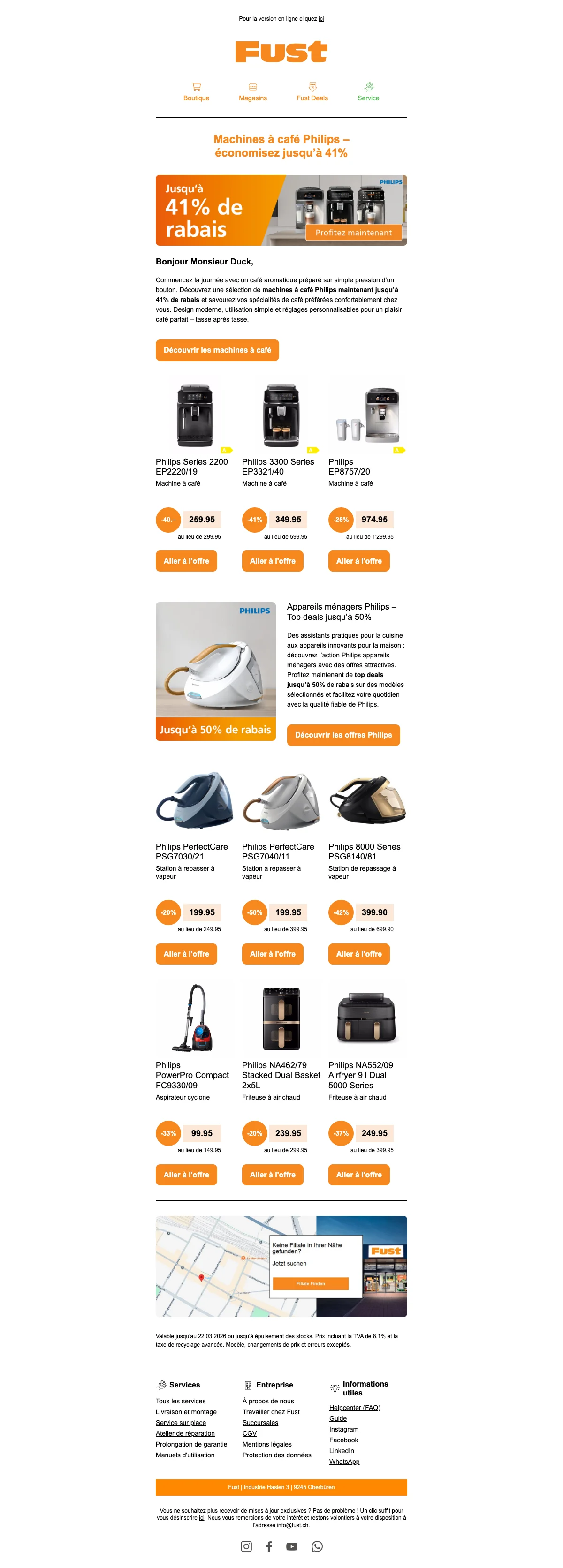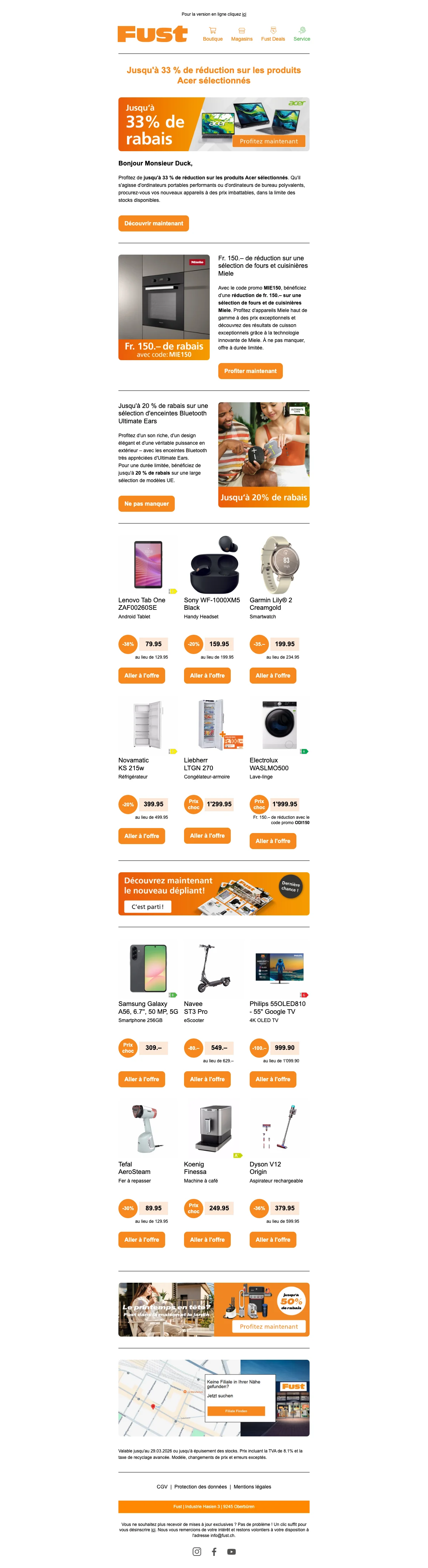 Sur la boutique en ligne Fust vous trouverez tout ce dont vous pouvez avoir besoin concernant la maison et le divertissement ! Un très vaste assortiment de produits de nombreux fabricants vous permettra de bénéficier d'un choix important afin que vous puissiez toujours trouver au meilleur prix ce qui correspond exactement à votre besoin ! Chez Fust, certains produits peuvent même être loués et une extension de garantie pouvant s'étendre jusqu'à 10 ans est proposée. De plus, pour que vous soyez certain d'avoir fait le bon choix, Fust vous propose un droit d'échange de 30 jours !