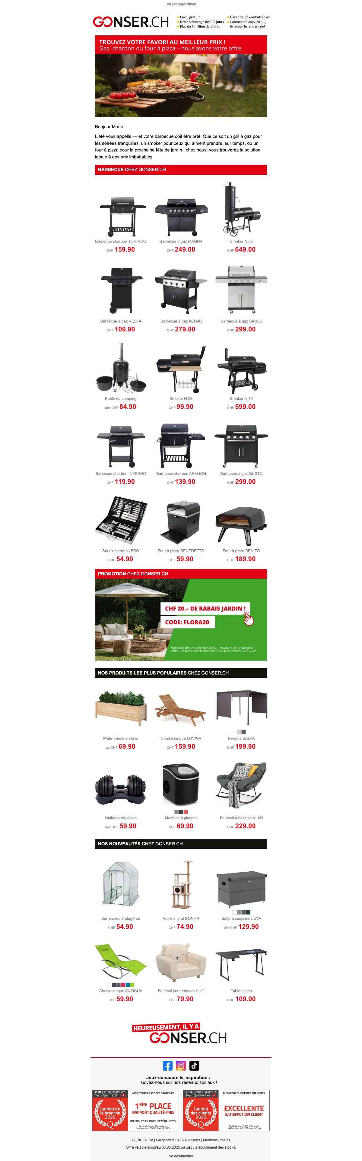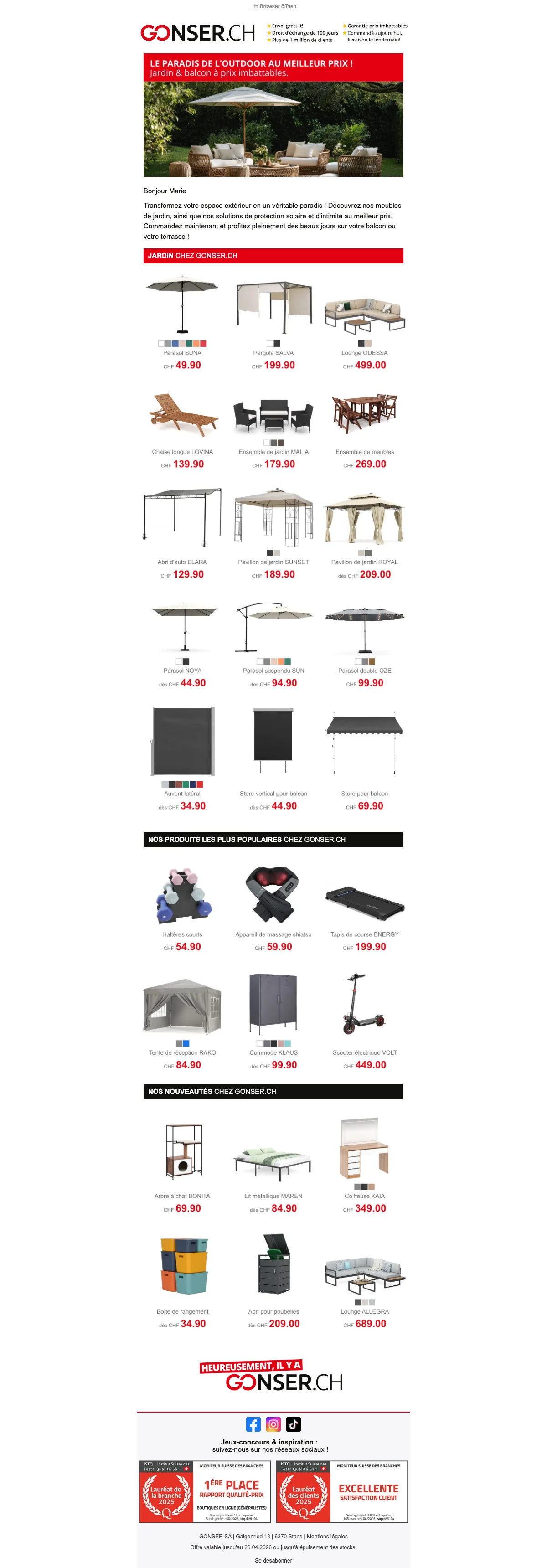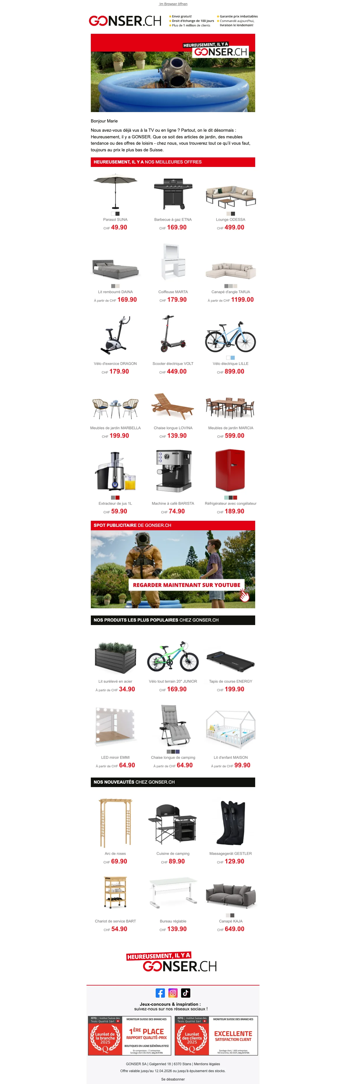 Le site de vente en ligne d'articles de jardin, maison, animaux et bien-être, Gonser.ch est aussi sur Soldesduck ! La boutique en ligne est assez récente, elle a été lancée en 2009. En quelques années, cette boutique a séduit le coeur des milliers de clients à travers la Suisse. La large variété des produits proposés (plus de 200 000 références) permet de combler toute la famille. En effet, vous trouverez des vélos, des salons de jardin, des piscines, des poussettes, du matériel pour bricoler ainsi que des accessoires pour animaux et bien plus encore pour votre vie de tous les jours.