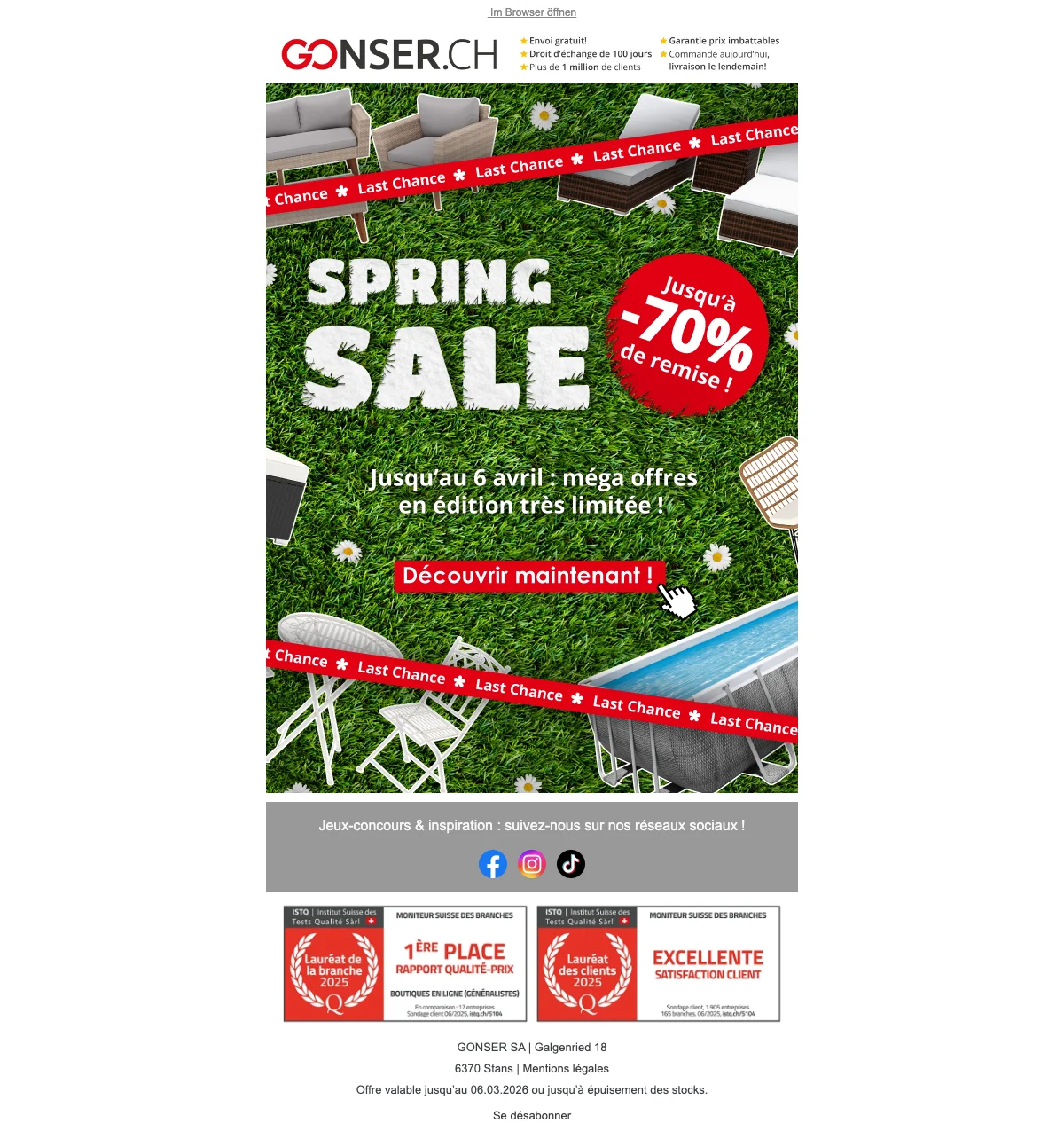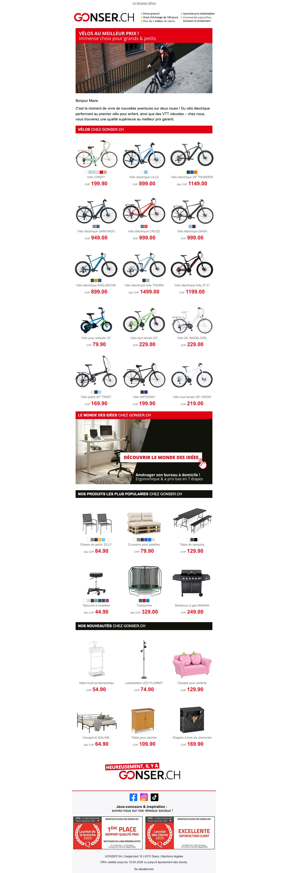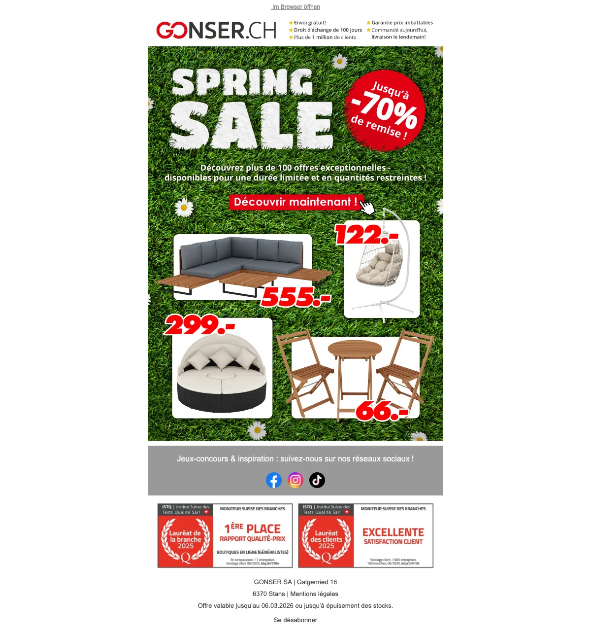 Le site de vente en ligne d'articles de jardin, maison, animaux et bien-être, Gonser.ch est aussi sur Soldesduck ! La boutique en ligne est assez récente, elle a été lancée en 2009. En quelques années, cette boutique a séduit le coeur des milliers de clients à travers la Suisse. La large variété des produits proposés (plus de 200 000 références) permet de combler toute la famille. En effet, vous trouverez des vélos, des salons de jardin, des piscines, des poussettes, du matériel pour bricoler ainsi que des accessoires pour animaux et bien plus encore pour votre vie de tous les jours.