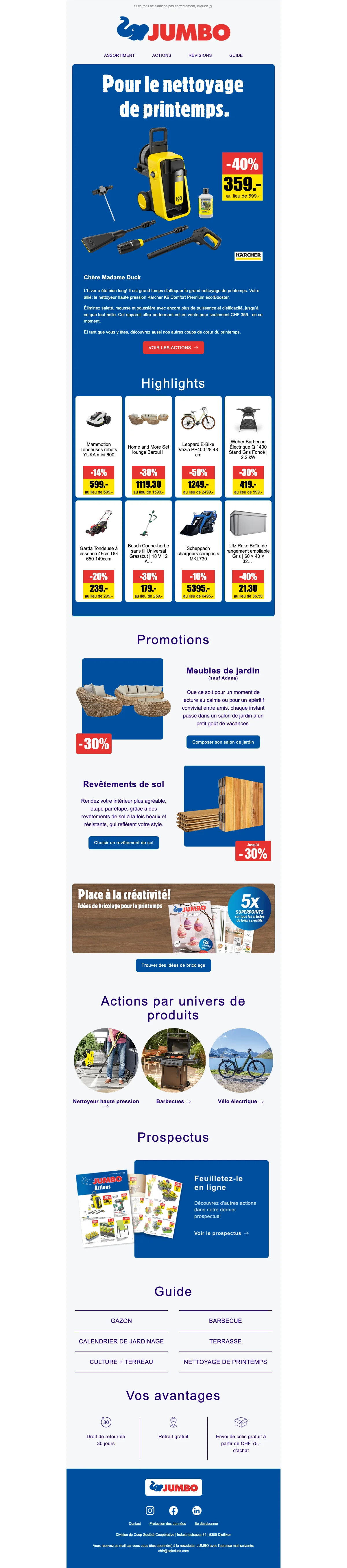 Toute l'année, profitez de remises exceptionnelles sur la boutique en ligne Jumbo.ch allant jusqu'à 60%. N'attendez plus pour économiser de l'argent sur vos travaux, votre vélo et pourquoi pas votre future piscine ! Ce ne sont pas les surprises qui manquent sur Jumbo.ch.