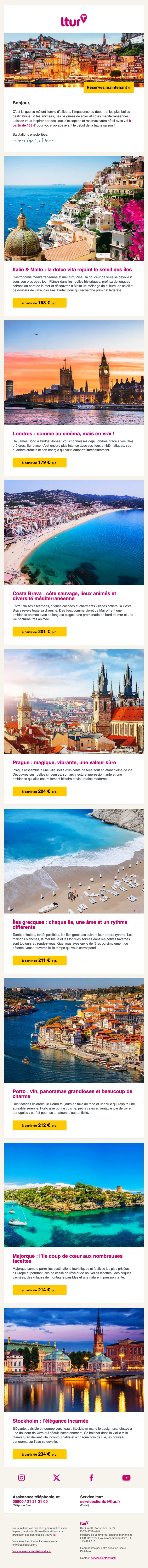 Vol + hôtel dès 158 € par personne pour réservations avant le début de la haute saison. Offre valable sur de nombreuses destinations (Italie, Malte, Londres, Costa Brava, Prague, îles grecques, Porto, Majorque, Stockholm) pour une escapade économique.