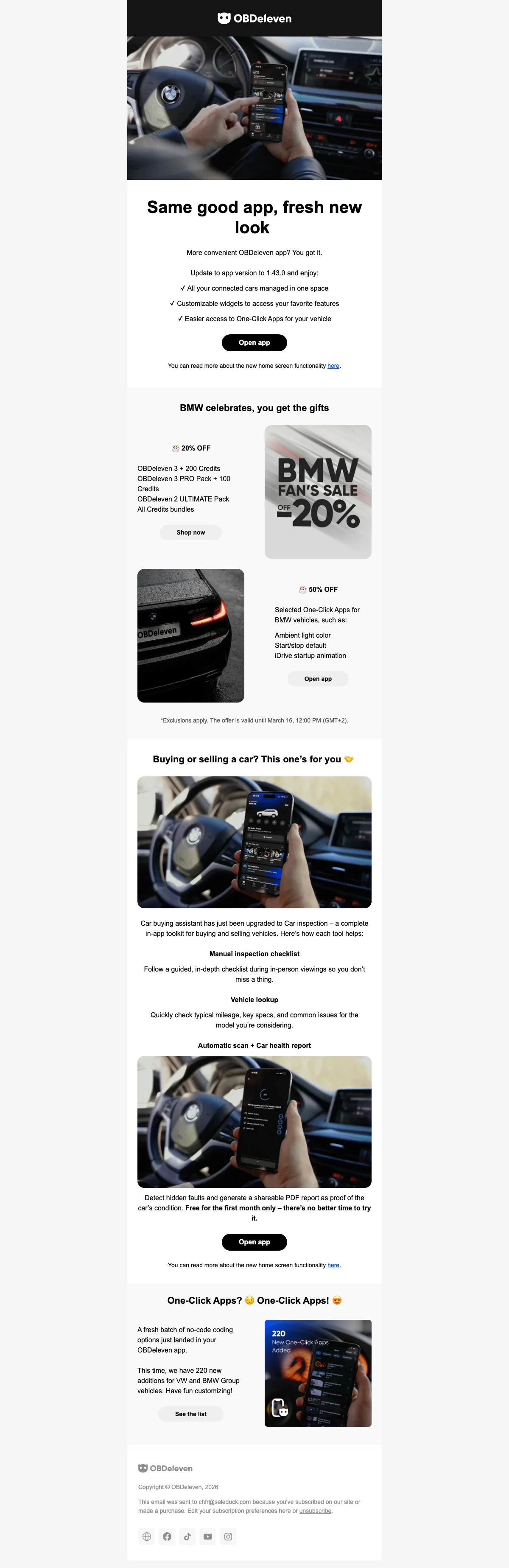 Transformez votre expérience de conduite en personnalisant les fonctionnalités de votre voiture avec les applications One-Click d'Obdeleven. C'est simple et rapide grâce aux applications préprogrammées!