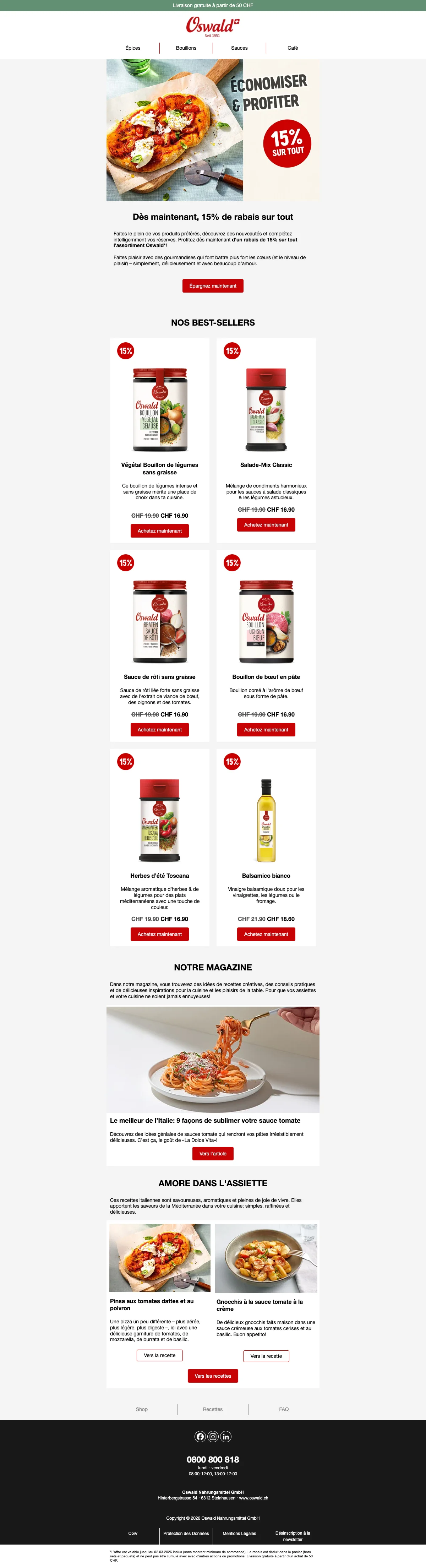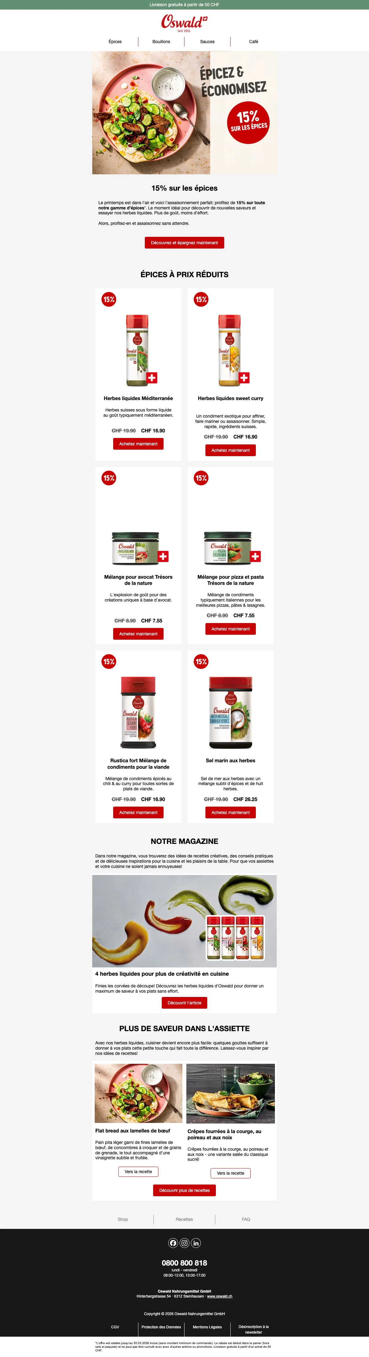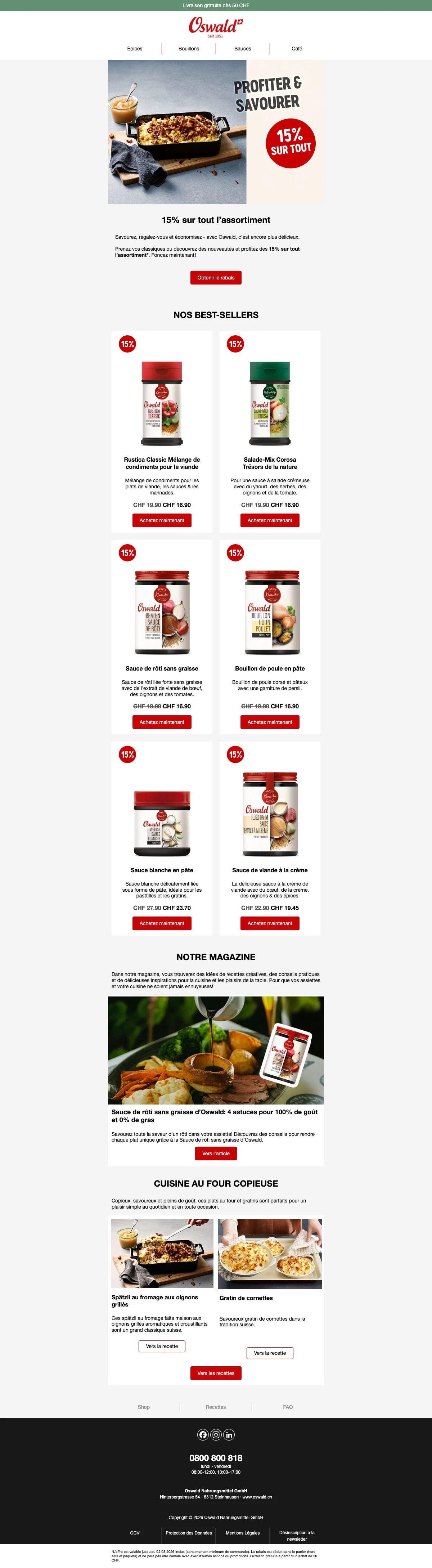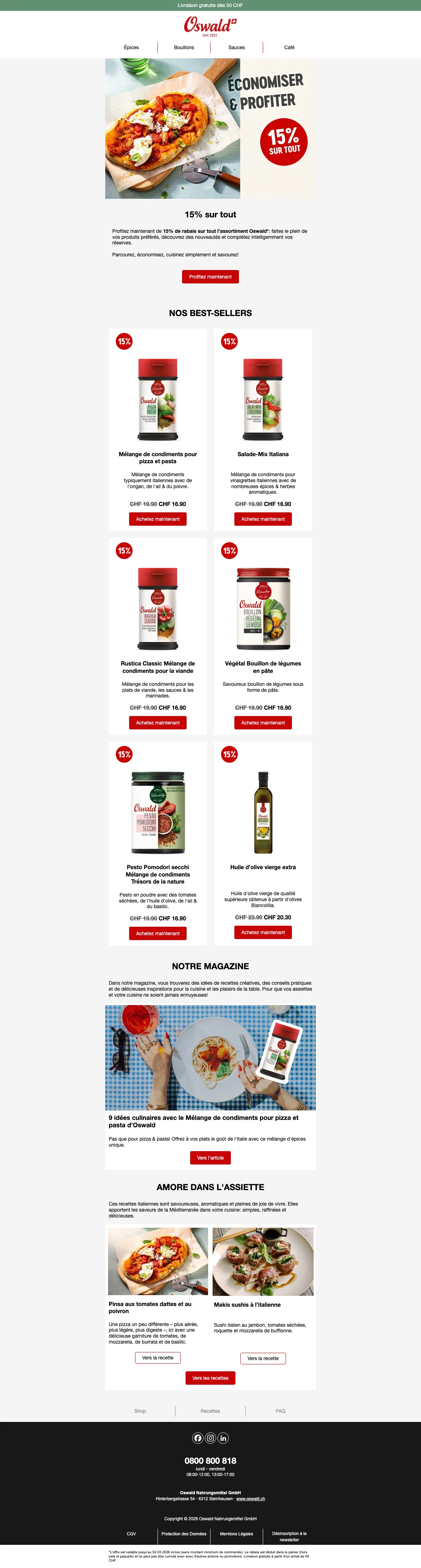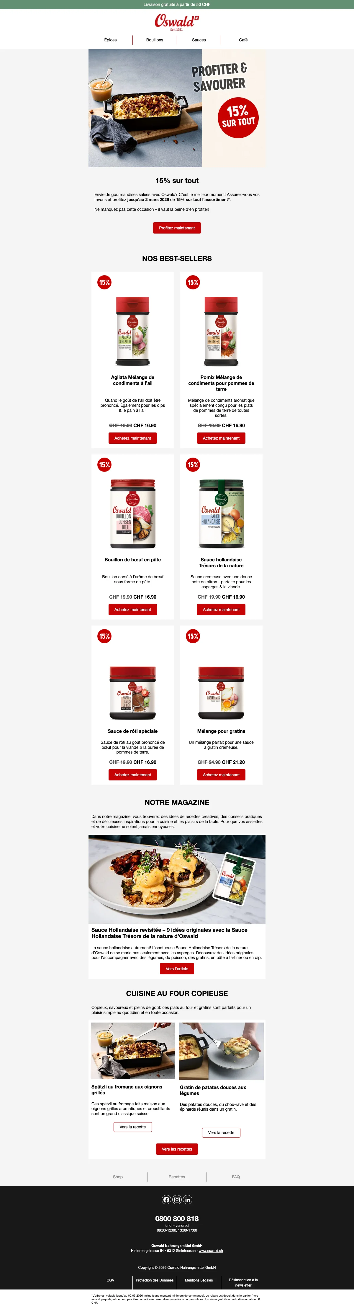 Plus de 200 conseillers sont disponibles pour vous en Suisse, et vous aident à trouver les idées recettes ou des astuces pour toutes les occasions. C'est une bonne excuse pour inviter des amis chez vous et leur faire découvrir vos nouvelles trouvailles gastronomiques. Vous pouvez également trouver vos recettes préférées à l'aide de la catégorie recettes de la boutique en ligne. Apprenez à faire des galettes de risotto au coeur de mozzarella ou un boeuf Stroganoff bien relevé en suivant à la lettre les recettes créées par les experts Oswald. Chaque mois, de nouvelles recettes sont ajoutées et vous font découvrir l'utilisation des épices et condiments Oswald. La cuisine n'aura alors plus aucun secret pour vous !