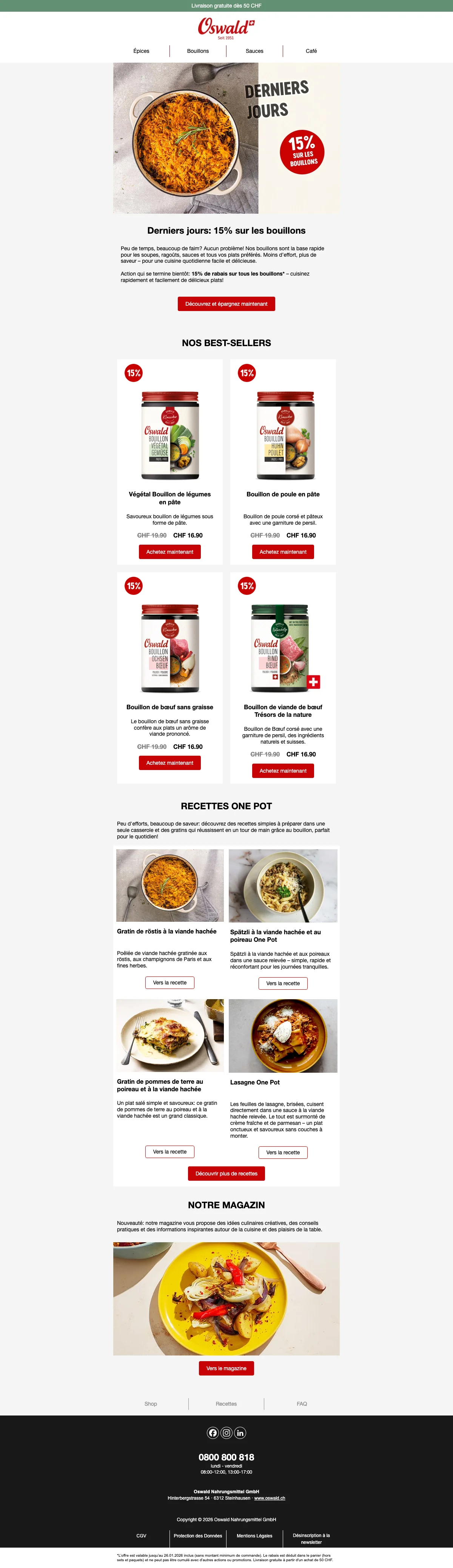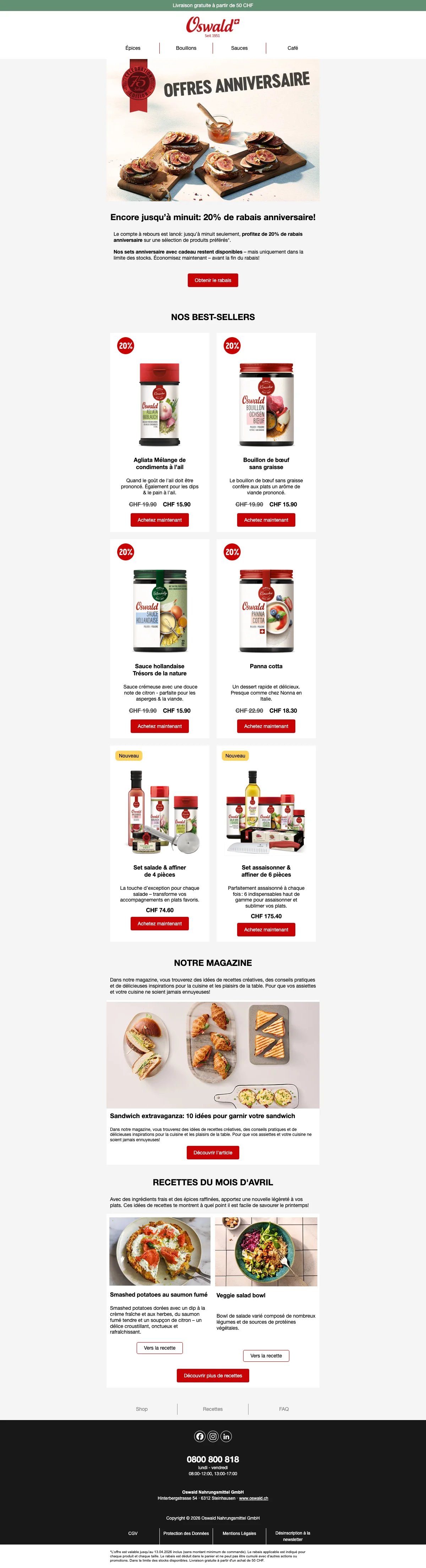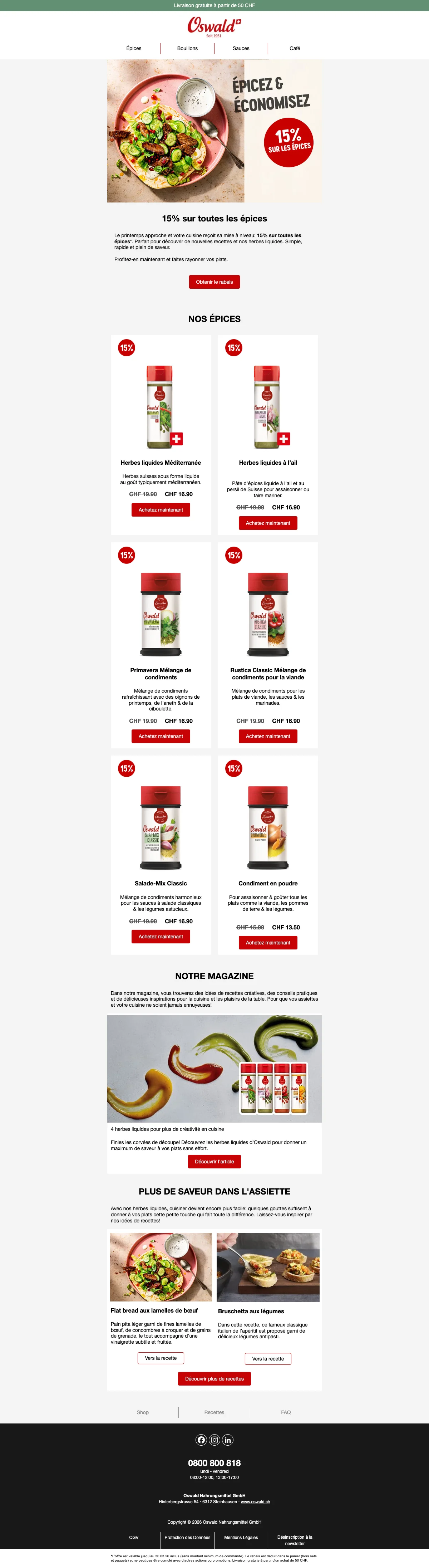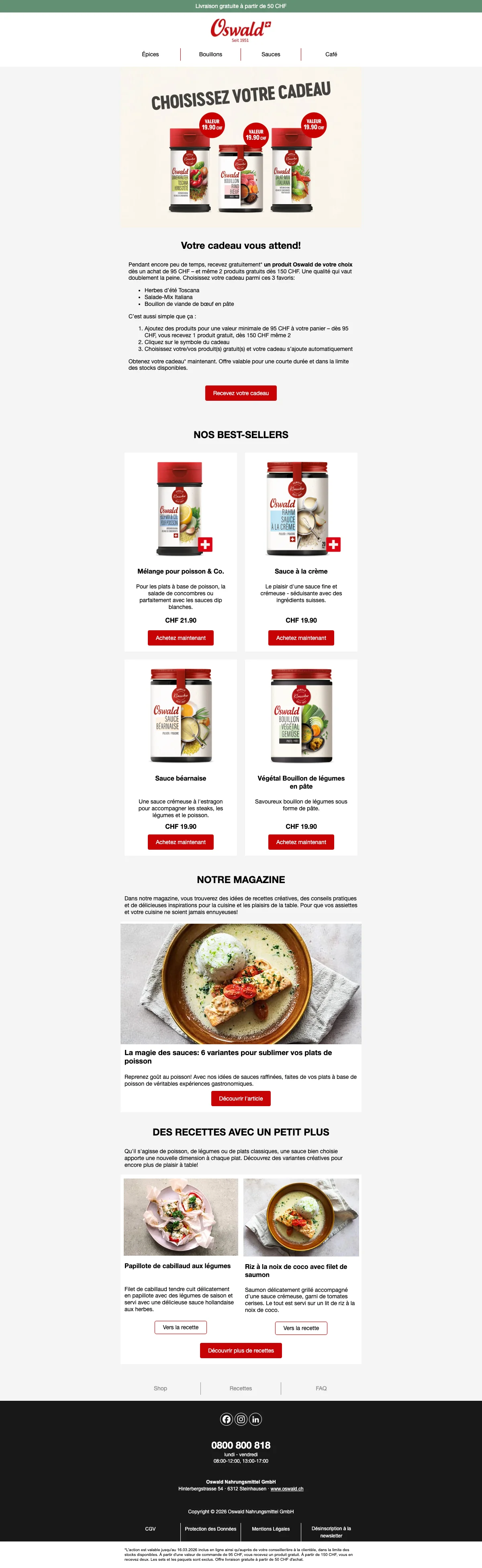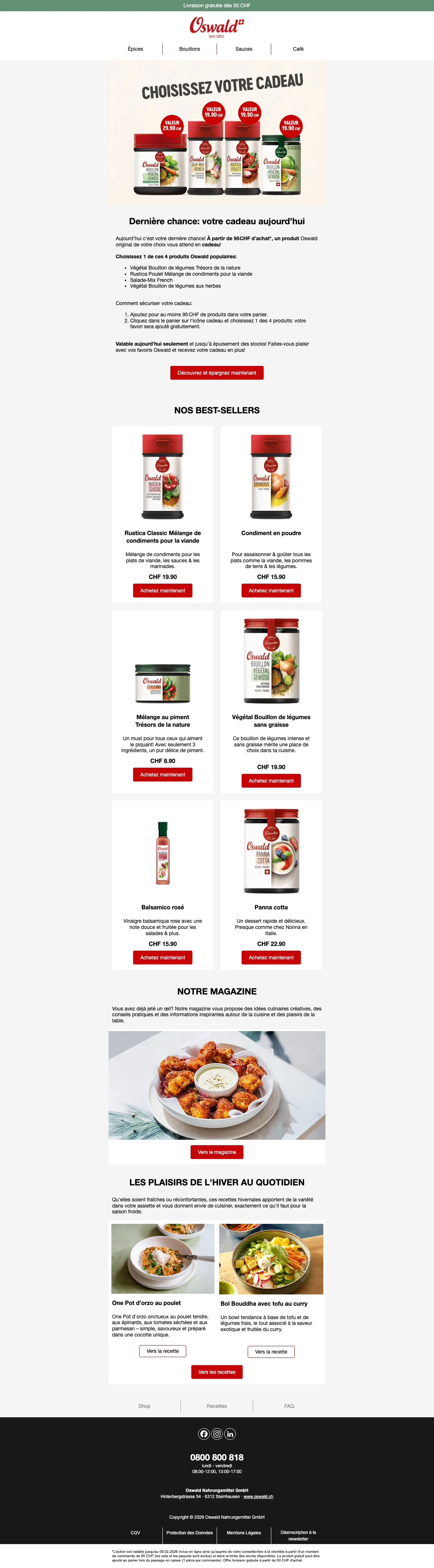 Plus de 200 conseillers sont disponibles pour vous en Suisse, et vous aident à trouver les idées recettes ou des astuces pour toutes les occasions. C'est une bonne excuse pour inviter des amis chez vous et leur faire découvrir vos nouvelles trouvailles gastronomiques. Vous pouvez également trouver vos recettes préférées à l'aide de la catégorie recettes de la boutique en ligne. Apprenez à faire des galettes de risotto au coeur de mozzarella ou un boeuf Stroganoff bien relevé en suivant à la lettre les recettes créées par les experts Oswald. Chaque mois, de nouvelles recettes sont ajoutées et vous font découvrir l'utilisation des épices et condiments Oswald. La cuisine n'aura alors plus aucun secret pour vous !