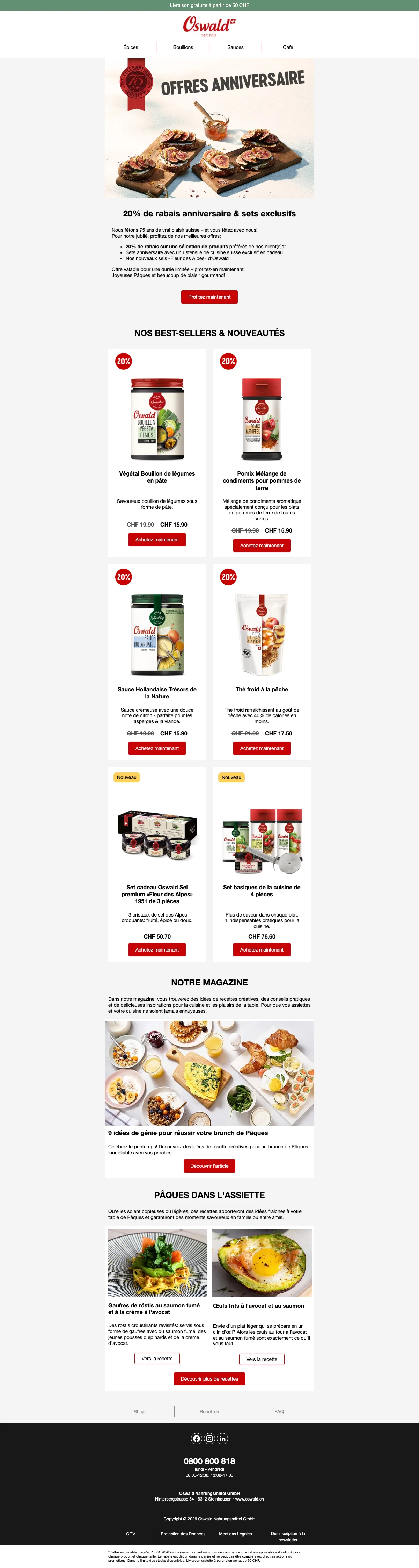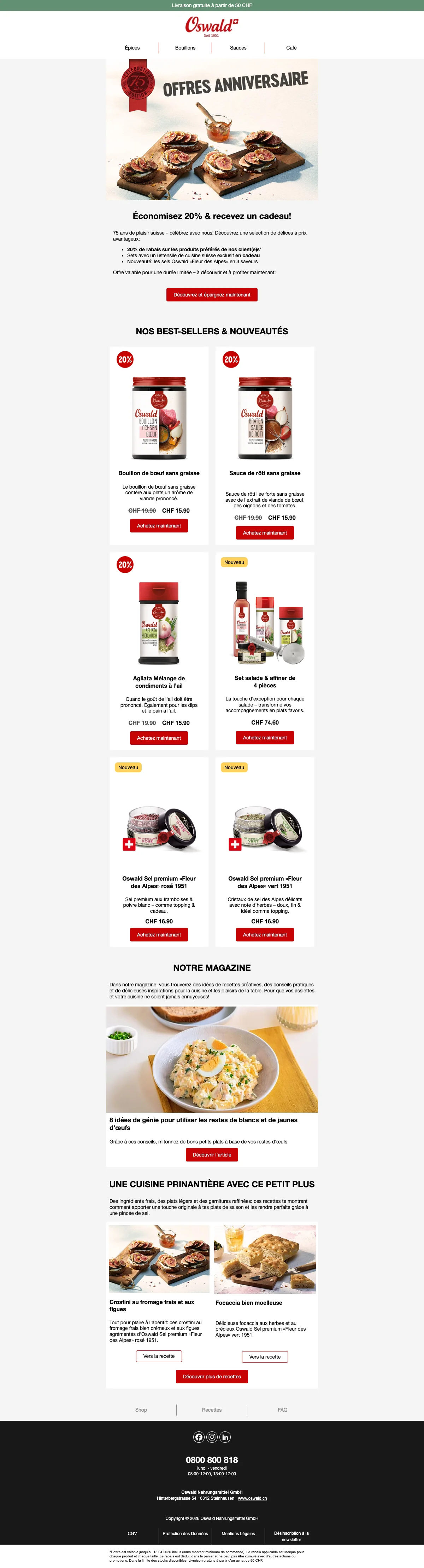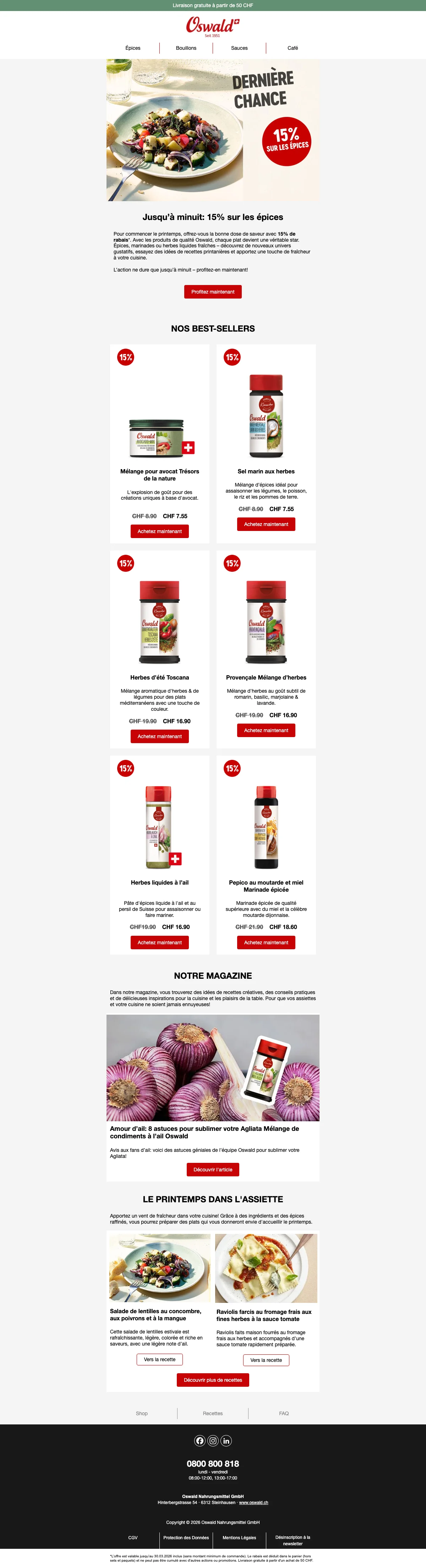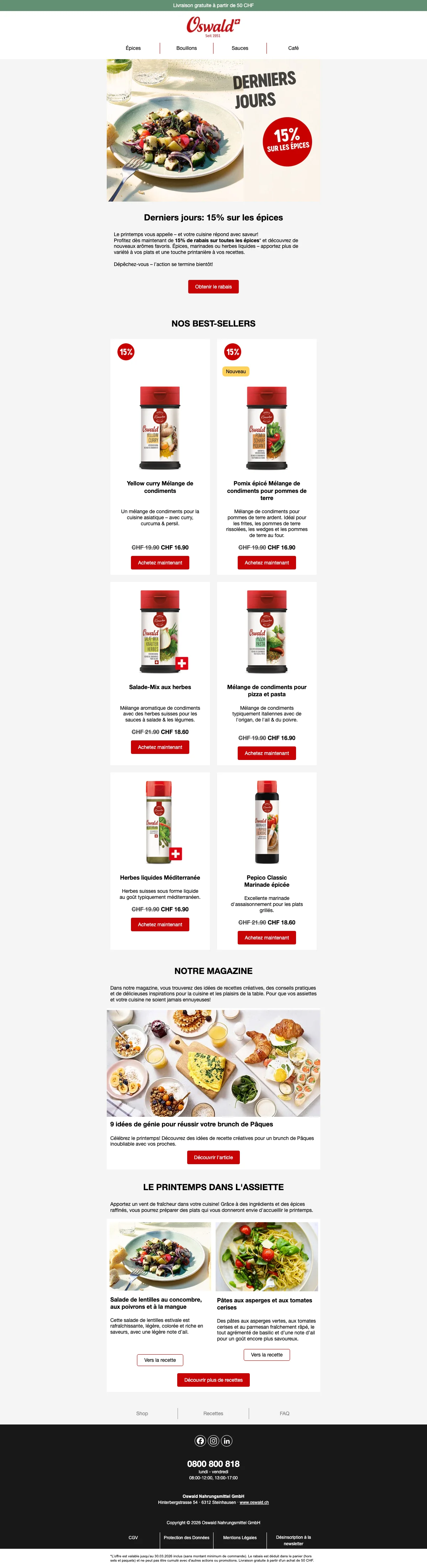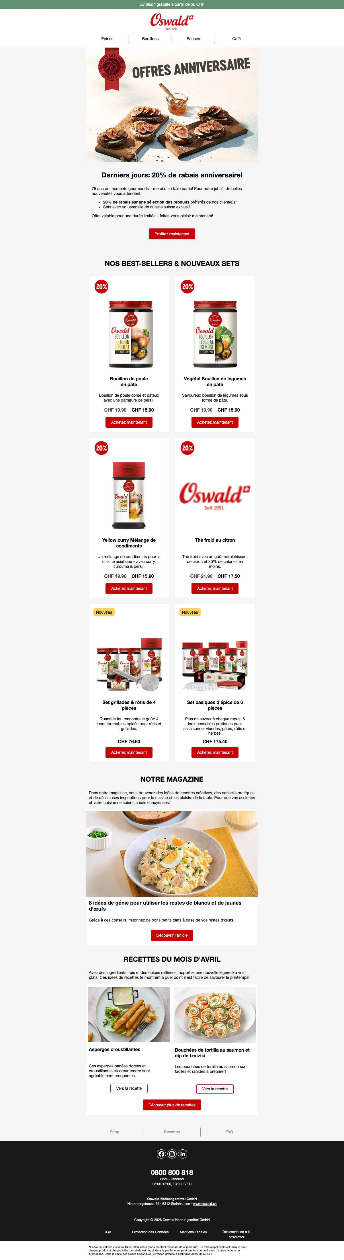 Plus de 200 conseillers sont disponibles pour vous en Suisse, et vous aident à trouver les idées recettes ou des astuces pour toutes les occasions. C'est une bonne excuse pour inviter des amis chez vous et leur faire découvrir vos nouvelles trouvailles gastronomiques. Vous pouvez également trouver vos recettes préférées à l'aide de la catégorie recettes de la boutique en ligne. Apprenez à faire des galettes de risotto au coeur de mozzarella ou un boeuf Stroganoff bien relevé en suivant à la lettre les recettes créées par les experts Oswald. Chaque mois, de nouvelles recettes sont ajoutées et vous font découvrir l'utilisation des épices et condiments Oswald. La cuisine n'aura alors plus aucun secret pour vous !