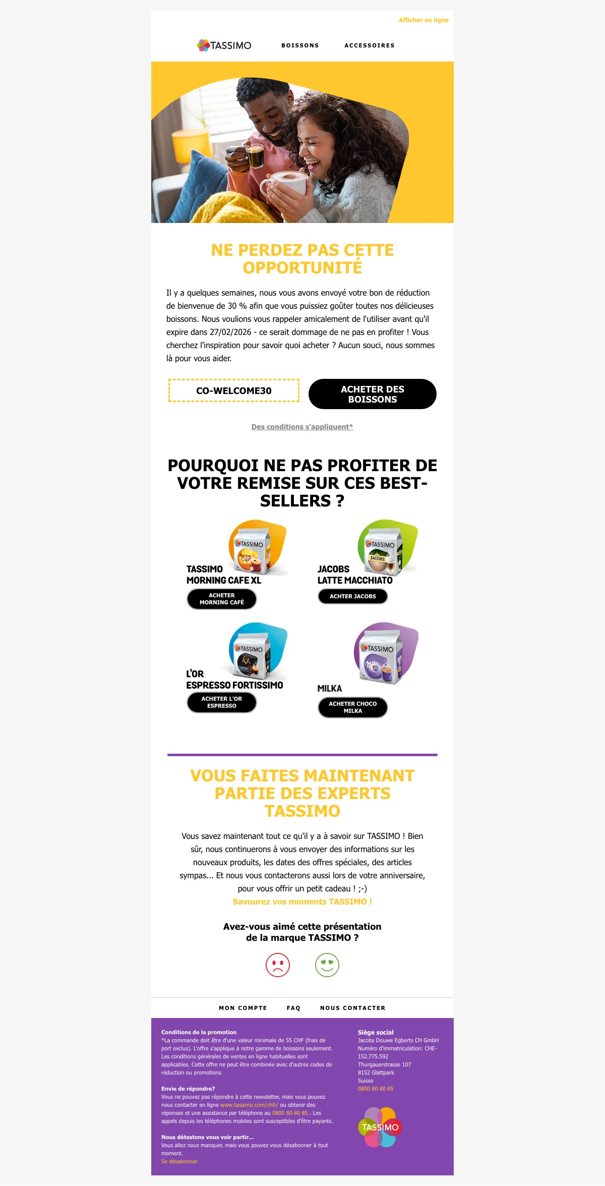 | CO-WELCOME30 | Tassimo code promo 30% de réduction sur toutes les boissons |