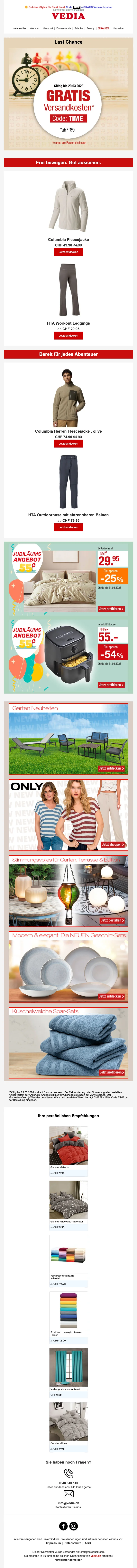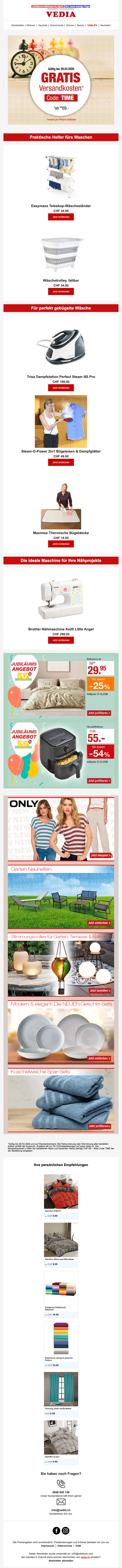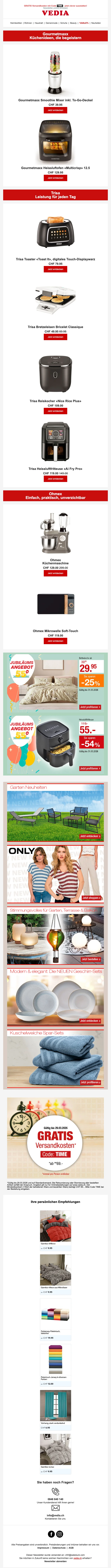 Fondée en 1971 à Genève, Vedia est une entreprise de vente à distance Suisse. Elle propose une grande diversité de produits à prix très raisonnables toute l'année. C'est la boutique en ligne pour le sport, la mode, la cuisine et l'ameublement ! Sur la boutique web, vous pouvez trouver des articles de mode pas chers, des produits pour l'extérieur ou même des voyages ! Retrouvez des marques comme Babyliss, Triumph, Philips, Electrolux, Moulinex, Koenig, Tefal à prix mini.
