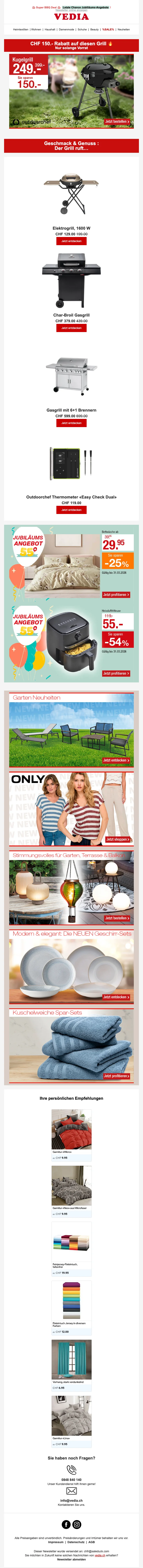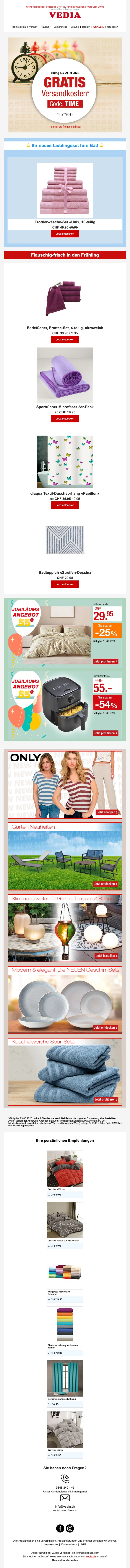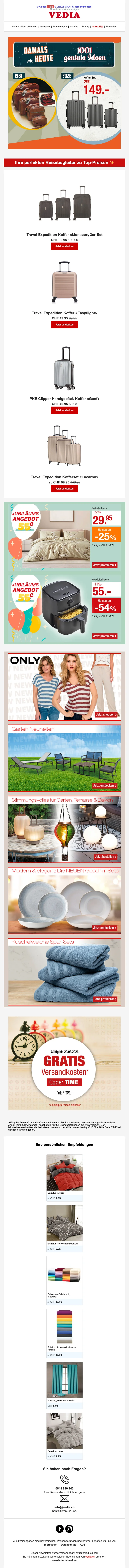 Fondée en 1971 à Genève, Vedia est une entreprise de vente à distance Suisse. Elle propose une grande diversité de produits à prix très raisonnables toute l'année. C'est la boutique en ligne pour le sport, la mode, la cuisine et l'ameublement ! Sur la boutique web, vous pouvez trouver des articles de mode pas chers, des produits pour l'extérieur ou même des voyages ! Retrouvez des marques comme Babyliss, Triumph, Philips, Electrolux, Moulinex, Koenig, Tefal à prix mini.