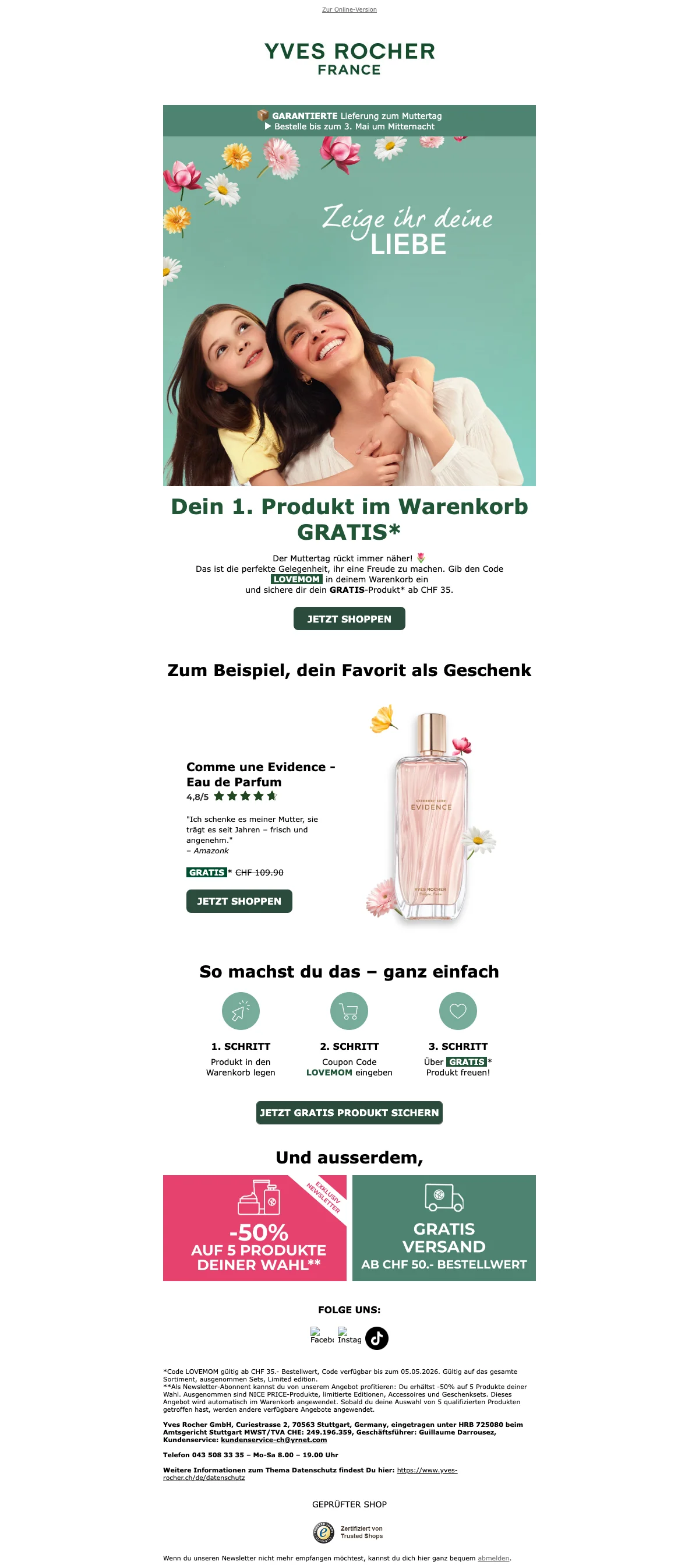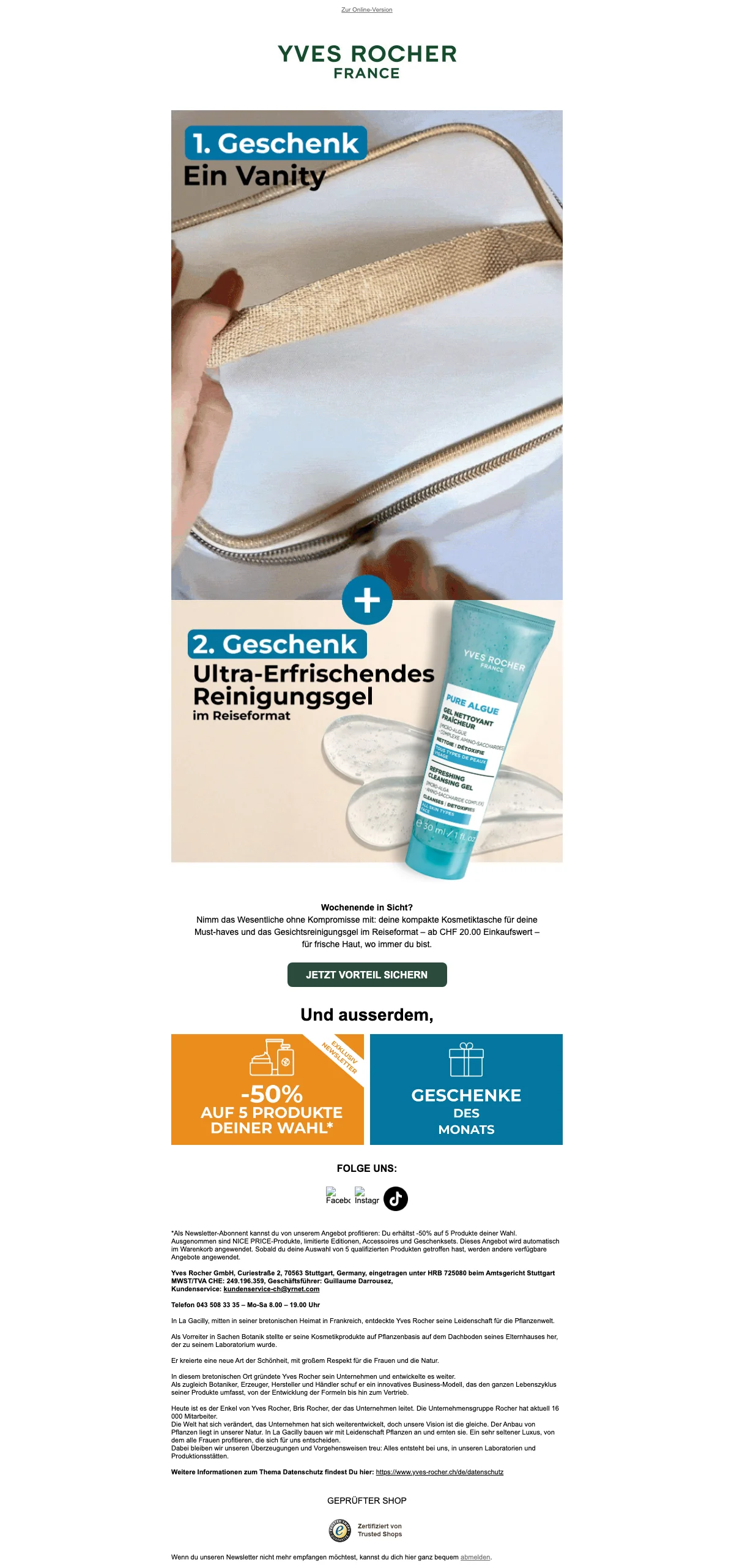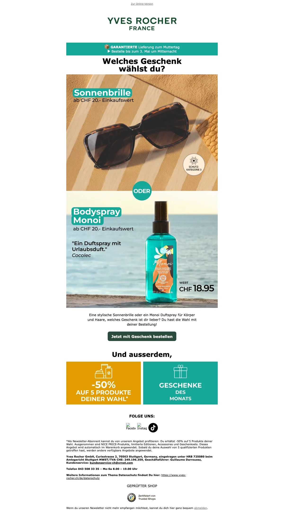 Il existe une multitude de magasins en propre, une boutique en ligne et il est aussi possible de profiter de l'expérience soin en instituts. Tous les meilleurs bons plan et code offre Yves Rocher Suisse sont regroupés sur cette page, alors n'attendez plus pour en profiter !