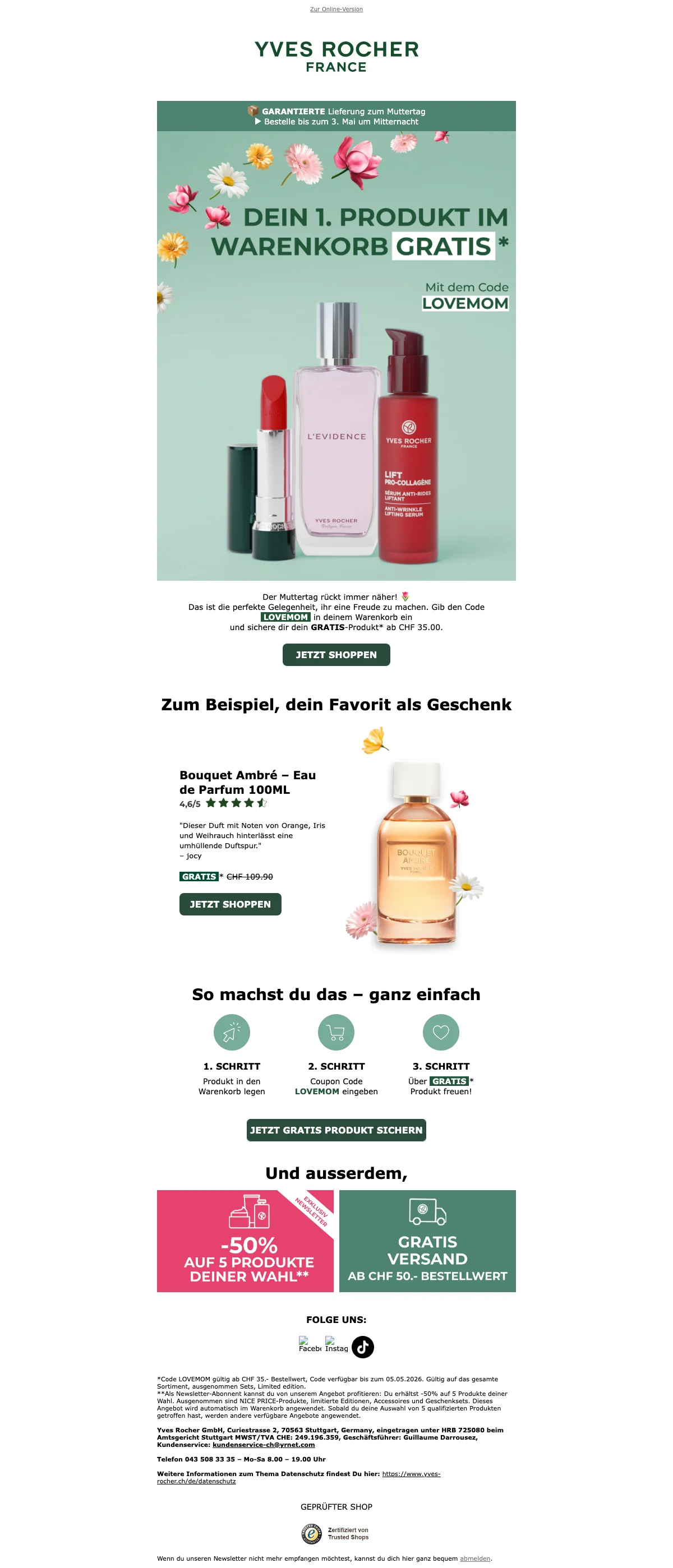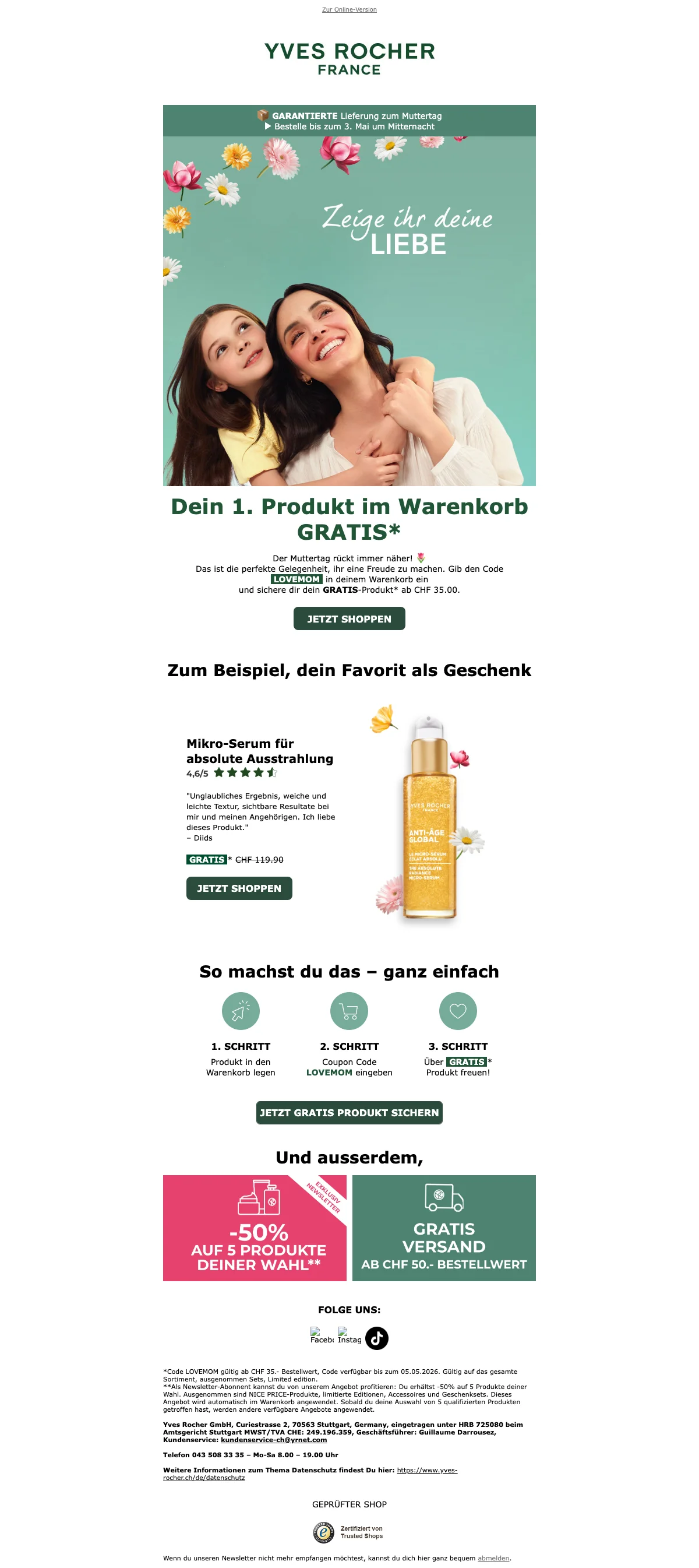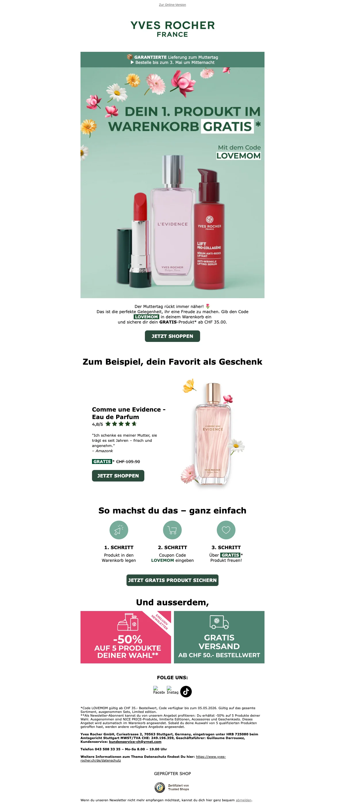 Toute l'année, la livraison est gratuite à partir d'un montant de CHF 15.00. En dessous, les frais de port sont de CHF 5.95, mais soyez attentif car il est très probable que Soldesduck ait un code promo Yves Rocher pour la livraison gratuite.